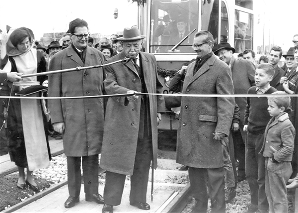 Bild: Eröffnung der Straßenbahnlinie zum Harthof am 8. November 1963 mit Oberbürgermeister Wimmer, links dessen Nachfolger Dr. Vogel